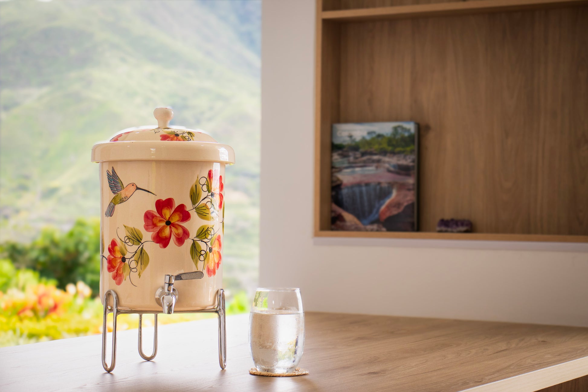 Filtro Cuenca del Viboral , purificador de agua consistente en vasija de arcilla microporosa con carbón activado y plata coloidal. Recipiente de almacenamiento elaborado en Cerámica, pintado a mano por artesanos especializados del Carmen del Viboral (Antioquia), apto para estar en contacto con el agua para consumo humano.